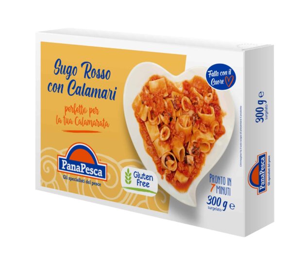 e pesce [28% Calamaro indopacifico (Uroteuthis duvauceli) pescato in Oceano Indiano occidentale (Zona FAO 51), Merluzzo atlantico (Merluccius hubbsi) e/o Merluzzo d’Alaska (Theregra chalcogramma), Totano gigante del Pacifico (Dosidicus gigas)], 14% pomodoro